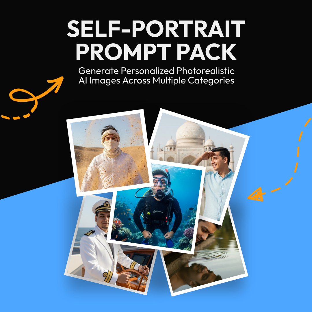 Specialized 100 AI prompts optimized for photorealistic self-portraits, eliminating need for professional photography setups.