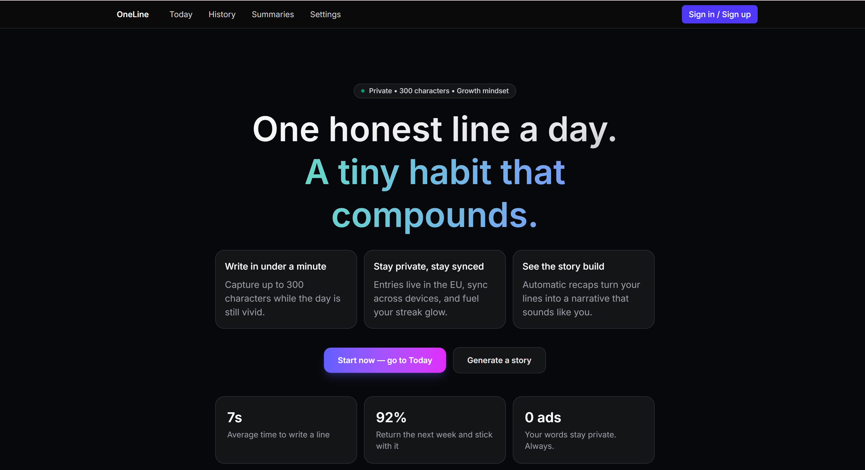 A minimalist journaling app where users write one honest line (up to 300 characters) daily, automatically compiling entries into monthly/yearly summaries that visualize progress, gratitude, and growth patterns over time.